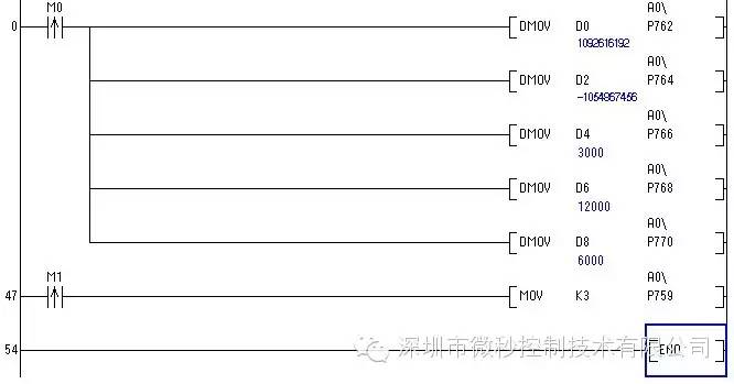 下例中,在D0‐D1 中保存同步速度(浮點),D2‐D3 中保存返回速度(浮點),D4‐D5 中保存